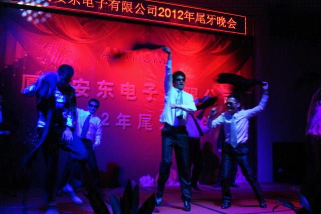 每年的尾牙晚會(huì)都是安東同仁期待的盛會(huì),我們在這個(gè)舞臺(tái)慶祝收獲,歡歌笑語;我們這這里展示才藝,妙舞輕歌;我們這這里釋放激情,同慶付出;我們這這里共敘緣分,滿懷感恩!晚會(huì)上的每個(gè)節(jié)目都有鮮明的特色,活力動(dòng)感的現(xiàn)代舞《roly poly》,在黑暗中絢麗多姿的熒光舞《夜光魅影》,婀娜多姿、舞姿飄逸有田園風(fēng)格的《茶山情歌》,霸氣十足的帥氣《安東style》。語言類節(jié)目也難得的好評(píng)如潮,《超幸福鞋墊》讓你覺得仿佛坐在電視機(jī)前聽購物頻道主持人如數(shù)家珍,又似乎看著央視春晚的搞笑小品。還有源于生活、體現(xiàn)百態(tài)的自創(chuàng)小品《賣切糕》,一氣呵成的創(chuàng)作編排,不斷拋出的笑點(diǎn),專業(yè)的角色演出都成就了經(jīng)典... 不論是朝氣蓬勃還是成熟穩(wěn)重,所有的同事都英姿颯爽,在舞臺(tái)上表現(xiàn)得酣暢淋漓。