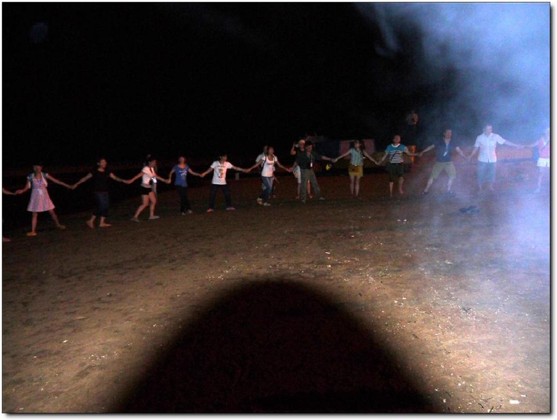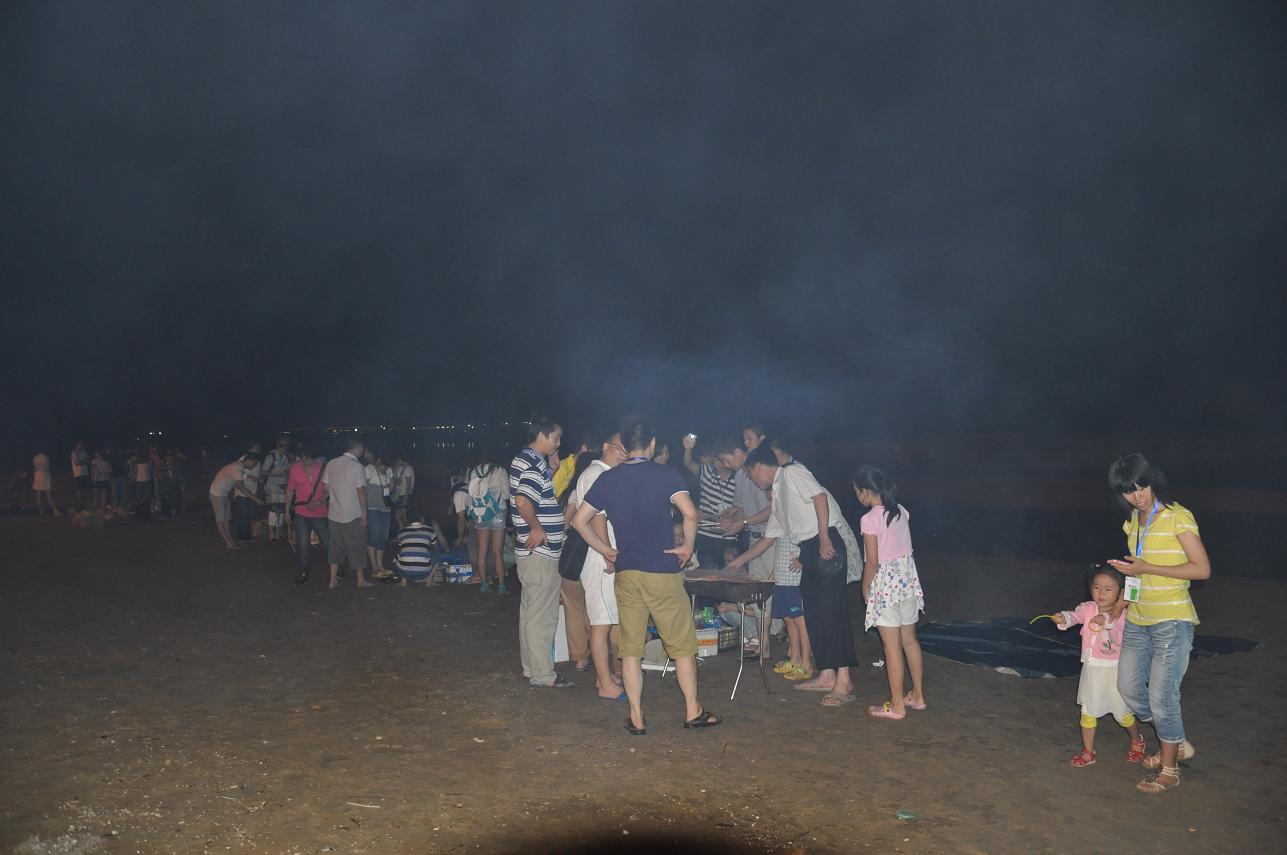 其實真正好玩的應(yīng)該是晚上吧,一開始是圍著準備著晚餐,吃完以后就是一個似乎沒有什么創(chuàng)意卻讓大家都很開心的節(jié)目---篝火晚會。其實這種大家都圍坐在篝火前玩著簡單但有懲罰的游戲,吃著零食,聊天的感覺還真的是很不錯.雖然會被煙吹的流眼淚,但篝火把每個人的臉都烤的紅紅的,而寒冷的海風也似乎消失了。守夜的篝火已燃到第二把,深夜海上的寒氣催促著我們的臉。躺在黏黏的防潮墊上,聽著海的咆哮,那巨大的聲響好似要把我吞沒?;炭种心枪上滔痰臍馕对诒乔痪従徲问?,真是別有一番風味。接下來就是燒烤了,有的同事在海邊戲水正酣,有的同事那邊熊熊的燒烤爐已經(jīng)點燃,香滑雞翅、可愛的士豆、清香的玉米、清甜的韭菜、肥肥的茄子,紛紛上陣,哇哇哇、真是讓人忙不過來,不知先吃哪樣才好。但我還得接受炭火的“炙烤”不斷鍛煉自己的燒烤技巧,我們吃著喝著玩著,長大了又何妨?我們的心還年輕著呢!就在這時一片海灘只聽見海浪與我們的歡笑聲。